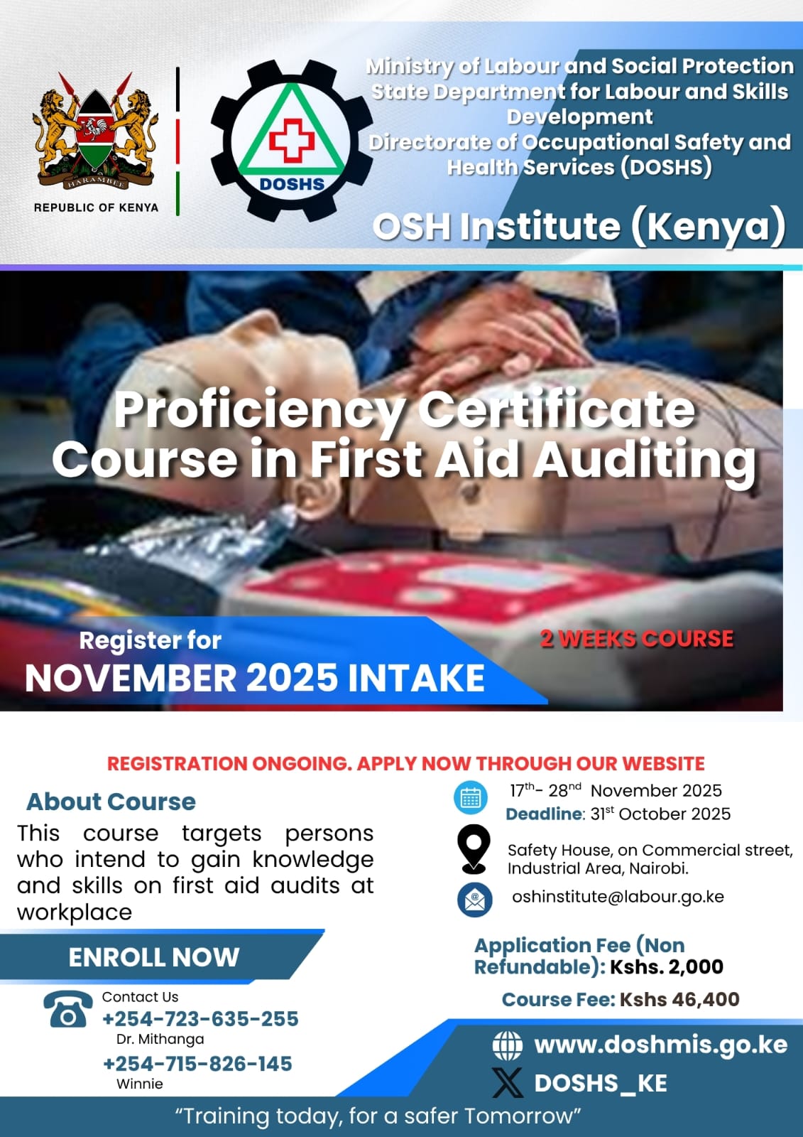 The State Department of Labour and skills Development carries out health and safety services through the Directorate of Occupational Safety & Health Services (DOSHS). The Department has its Headquarters in Industrial Area, safety house and has regional offices in twenty nine (29) counties. These services are carried out to ensure that every workplace isfree of any hazards, and complies to laid down standards to assure safety of employees. Some of these services include but are not limited to Registration of workplaces, Registration of plant, Registration of Approved persons and institutions, workplace inspection & audits, Examination & testing of plants, Accident investigation & WIBA processing.