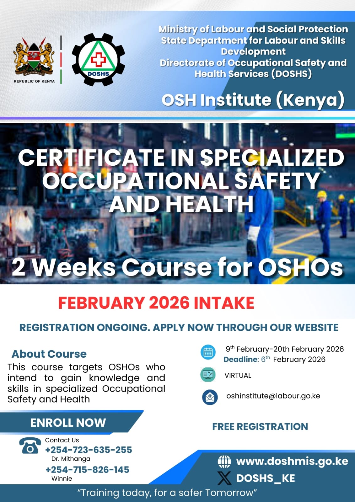 Intake: The 2 Week Certificate in Specialized Occupational Safety and Health Course